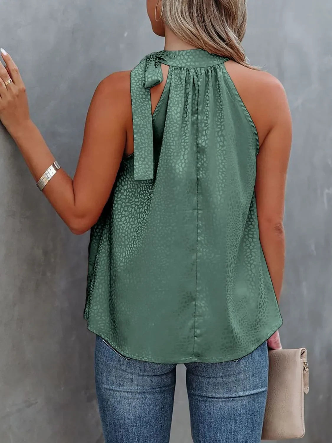 This sophisticated cami top features a beautiful spotted print on a luxurious, flowing fabric. The halter neckline with tie detail adds an elegant touch, while the gathered design creates a flattering silhouette. Made from soft, lightweight material perfect for warm weather wear. The versatile blush pink color pairs easily with both casual and dressy pieces. Ideal for layering or wearing alone, this piece transitions seamlessly from day to night. The relaxed fit and quality construction ensure both style and comfort.